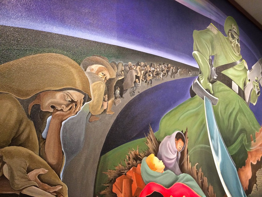 Encore une fois, à la fin du temps de la grâce, près de la ligne du milieu de la seconde murale, on y voit trois jeunes enfants comme dans une une maison détruite avec du bois et des briques, beaucoup aimerait pensé que les enfants dorment, mais, la dernière femme dans le chemin, tenant un enfant mort dans ses bras, pleure les enfants sans vie. Pour terminer avec le temps présent, observer la courbe de l’horizon de la seconde oeuvre, laissant pensé à la courbe de la terre, dans le chemin qui suis cette courbe, on y observe une foule nombreuse, on y voit les peuples sous domination, triste, amère, et voyageant très léger vers un lieu commun, un peu comme les trains de l’Allemagne nazi qui déportait de force les juifs, et autres victimes de l’Holocauste vers les camps de concentrations.