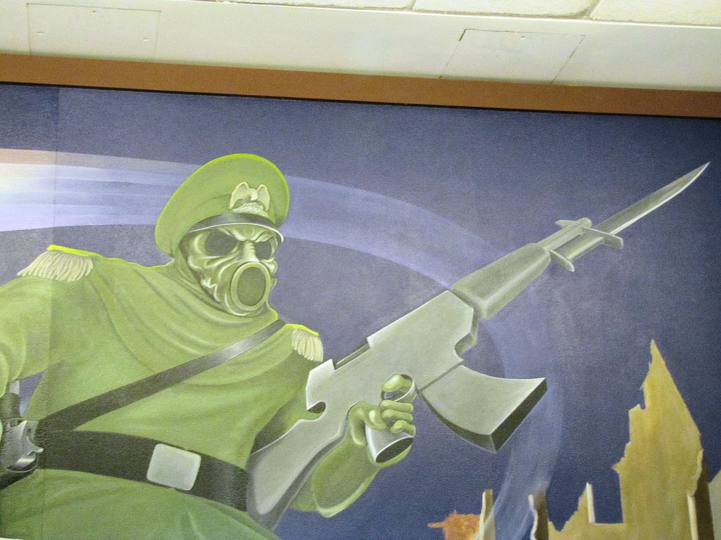 Lorsqu’on regarde l’arme dans le bras gauche du soldat, on y vois un AK-47 Kalashnikov avec baïonnette. Cette arme est d’origine Russe, ce qui laisse présager que la Russie pourrait dominer le monde à venir avec la Chine incluant d’autre pays. Portez une attention particulière sur les symboles des casquettes des deux soldats, les deux portent des aigles. L’aigle impériale était utilisé par l’empire Romain, mais lors de sa chute, le Saint Empire romain germanique(l’Allemagne) a repris « Reichsadler » c’est à dire l’aigle impérial et l’a utilisé jusqu’en 1935. L’aigle en question sur la seconde oeuvre déploie ses ailes pour commencer à s’envoler, laissant sous entendre une renaissance, un nouvel envol, un nouvel ordre mondial. Il est possible que l’Allemagne soit à la tête des peuples du monde à venir, possible également que l’antéchrist puisse être d’origine allemande, ces pays gouverneraient le monde à venir sous de solide alliances entre eux. Comme on peut le voir par l’image, le monde à venir sera une désolation, tout ce qui était beau à la vue aura été détruit(Ésaïe 2:10). Le soldat porte également un masque à gaz, car une bonne partie de la surface de la terre aura été détruite(Esaïe 2; Sophonie 1:2-3) et le monde à venir sera dans la noirceur, l’obscurité, dans les ténèbres (Jérémie 4:23; Ésaïe 13:10-13; Joël 2:10-11; 2:31; Amos 8:9; Apocalypse 6:12-17).