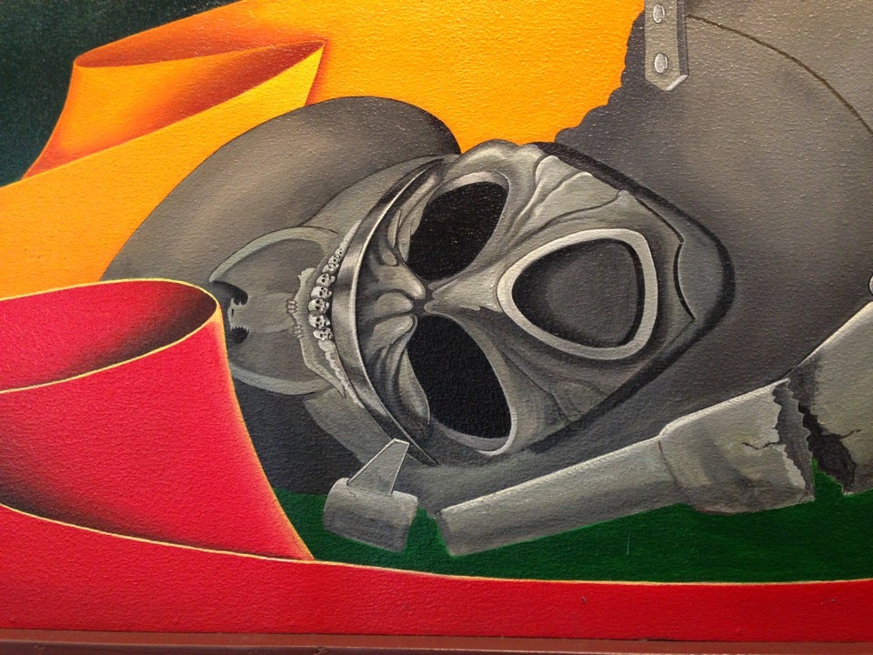Nous voyons dans la seconde moitié de l’œuvre de Tanguma tout le corps du soldat est du côté ténébreux, du côté du temps des nations, à l’exception du bras et la jambe côté droit qui se trouve sur le côté du présent à venir de l’image. Porter attention sur le fait que le soldat ici n’est pas une statue, mais mais bien un soldat réel, ce qui s’explique par le fait que le monde à venir sera sous une dictature militarisé comme la Russie, comme la Chine, sous un système communiste, où le contrôle des naissance sera contrôlé afin de maintenir l’humanité mondiale sous les 500 millions d’individus sur terre, il y aura une nouvelle langue mondiale, laissant sous-entendre que l’anglais ne sera plus la langue dominante mondialement. On parle également de reproduction intelligente afin d’améliorer la forme physique, on parle ici de transhumanisme, il y aura une monnaie universelle virtuelle, ce que nous voyons ici est la recette parfaite pour maintenir le reste de l’humanité, dans un esclavage infini et absolu, tout comme Nimrod après le déluge imposa sa domination sur l’humanité de l’époque, ce qui est le rêve de tout dictateur en puissance, ce rêve deviendra réalité dans les temps à venir sous la bête, sous l’antéchrist, mais son terme ne sera pas infini, il lui a été donné de régner sur la terre que 3.5 années.