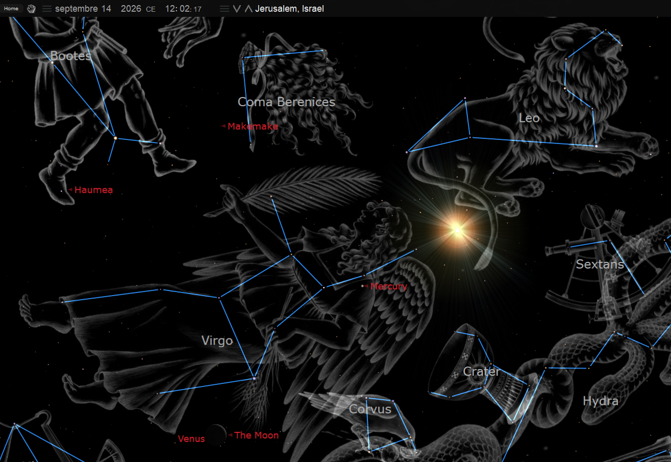 On ne peut passer à côté de Vénus, comme vous le savez elle est associé au Christ, Jésus, à l’Étoile du matin. À partir de ce moment, au 14 septembre 2026, l’Église est déjà enlevée, le signe ici nous rappelle que le Messie reste le centre du plan divin. Pour Israël, il est encore caché (ils ne le reconnaissent pas encore comme Messie), Il est présent, mais voilé, caché.