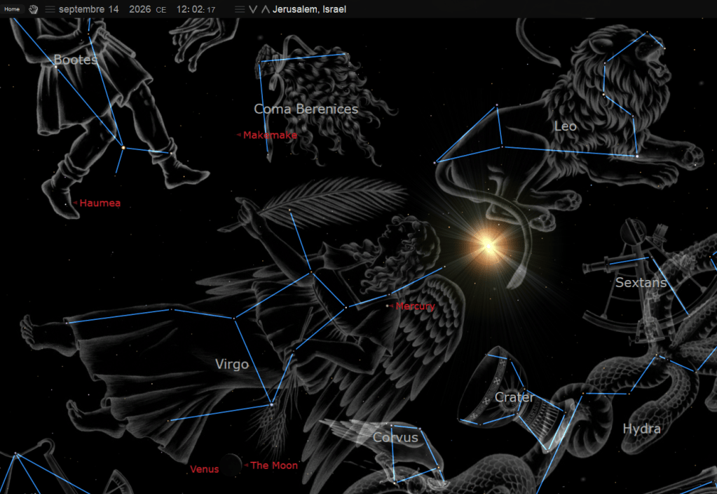 Ici, l’image nous montre le soleil dans la constellation de la Vierge. Le Soleil est une association au Père, à l’Éternel, à Dieu. Après l’enlèvement de l’Église à la fête des trompettes du 10 septembre au couché du soleil jusqu’au 13 septembre 2026 au couché du soleil en Israël, Dieu se tourne de nouveau vers son épouse terrestre, Israël. Cela marque donc, le recentrage du plan divin sur Israël après la fin de l’ère de l’Église.