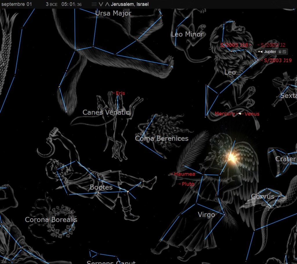 Qu’est-ce que cette image nous montre exactement? Elle nous montre le ciel comme les Mages le voyaient au 1er septembre -3 av J-C, naturellement sans les dessins de la femme et des d’animaux. Ce ciel est celui de dix jours avant la naissance du Jésus au 1e septembre -3 av J-C, soit dix jours avant la fête de l’Éternel du Rosh Hashana(fête des Trompettes). Au premier septembre de l’an -3, en ce jour, c’était la période des « jours redoutables » (Yamim Noraïm), ce qui signifie dans le calendrier juif, 10 jours de préparation, d’attente, pour le jour du jugement, signification de la fête des trompettes(Rosh Hashana).