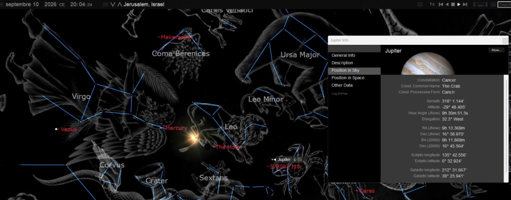 Mercure et Jupiter dans le Cancer, au moment de l’éclipse précédant la Fête des Trompettes 2026, annoncent l’approche d’un événement divin majeur. Le lien prophétique avec l’enlèvement de l’Église, Mercure annonce (le cri, le shofar, le messager), Jupiter rassemble le Roi, et les juste, Cancer reçoit (c’est la maison céleste), L’Argo (le vaisseau de l’Église)transporte ceux qui appartiennent à Christ. Cette image céleste complète de l’Enlèvement dépeint la réunion finale des fidèles dans la demeure céleste ou une place nous a été préparé. C’est l’annonce céleste du retour du Roi, venant chercher son Épouse préparée (Vénus dans la Vierge). Le Cancer représente la Maison du Père, et l’Argo, le vaisseau céleste, évoque le passage final des fidèles vers le Royaume. L’ensemble forme une parabole céleste de l’enlèvement, elle est à la fois un avertissement pour les impies de ce monde et une promesse pour le véritable croyant.