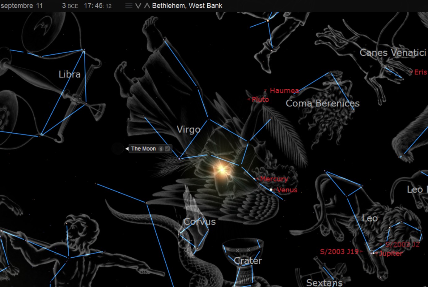 Une femme enveloppée du soleil, c’est à dire la constellation de la vierge enveloppée du soleil, cette information nous donne la saison et le mois de l’année, ici c’est en automne, au mois de septembre, la lune sous ses pieds nous donne le jour du mois, et la couronne de douze étoiles sur sa tête correspond à l’année du signe. Je m’explique, en tout temps, la constellation de la vierge à les 9 étoiles de la constellation du lion sur sa tête, mais, le signe de la prophétie impliquait une couronne de 12 étoiles, et l’accomplissement de la prophétie se réalisa le 11 septembre -03, au jour de la naissance de Jésus, les trois planètes errantes: Jupiter, la planète du roi, Vénus, l’étoile du matin et Mercure le messager, venaient démontrer l’accomplissement de la prophétie avec la couronne de douze étoiles sur la tête de la constellation de la vierge ainsi que la lune à ses pieds tel que mentionné dans apocalypse 12, démontrant ainsi également le lien entre apocalypse 12, et la fête des trompettes un 11 septembre, qui correspond à la date future du jour du Seigneur.