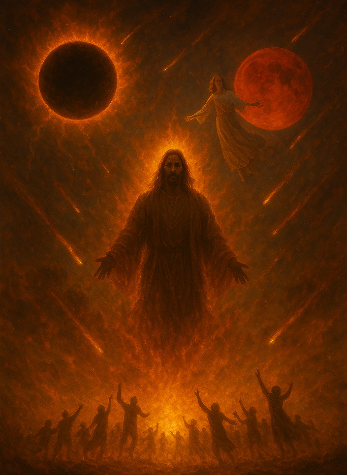 L’image ici est parfaitement dans l’esprit du jour du Seigneur, nous y voyons Jésus au milieu d’une flamme de feu lors de son avènement, 2Thess 1:6-10, nous y voyons également le mystère du soleil noir et de la lune entièrement rouge sang le jour d’une éclipse lunaire, Actes 2:20; Ap 6:12, ainsi que toutes les tribus de la terre qui se lamenteront à cause de lui(Jésus) au jour de l’Éternel, Ap 1;7. En ce jour-là, l’Éternel fera coucher le soleil à midi, Et la terre sera obscurcie en plein jour, Amos 8:8-10.
