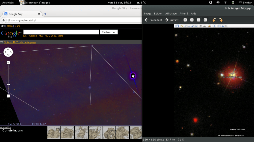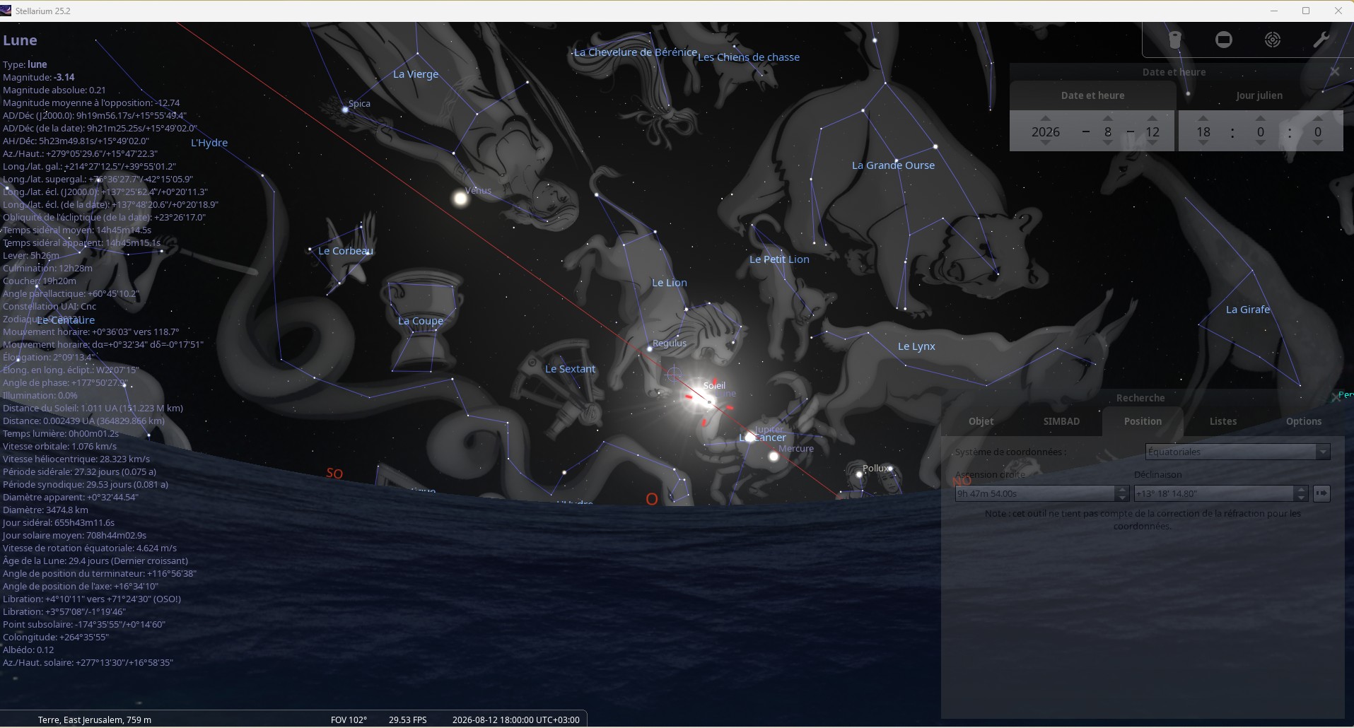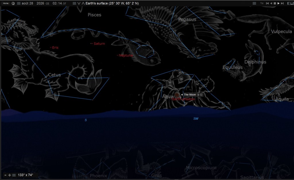 Pour ceux que me suivent depuis mets début, vous reconnaîtrez de vieilles images qui aujourd’hui donne finalement un sens, et ce n’était pas pour rien que l’image de gauche était cachée sous le bouton infrarouge dans Google Sky. Ceux qui utilisaient à l’époque le navigateur de Windows XP, n’avaient pas l’option infrarouge pour voir cette image, mais ceux qui utilisaient le fureteur Firefox par exemple et autres, le pouvaient, mais encore fallait-il savoir que l’astre était à cet endroit. C’est autour de 2010 que j’ai pris ces images de Google Sky, celle de gauche est en infrarouge, l’autre à droit sans l’infrarouge, cette application web n’existe plus aujourd’hui, mais si vous regardez les deux images, vous pouvez voir les coordonnées de l’astre en question. La position se trouve près de la patte avant de la constellation du lion. Sur la seconde image, vous pouvez observer un + dans un cercle, ceci correspond à la coordonnée de Google Sky de la première image le jour de l’éclipse lunaire du 12 août 2026.